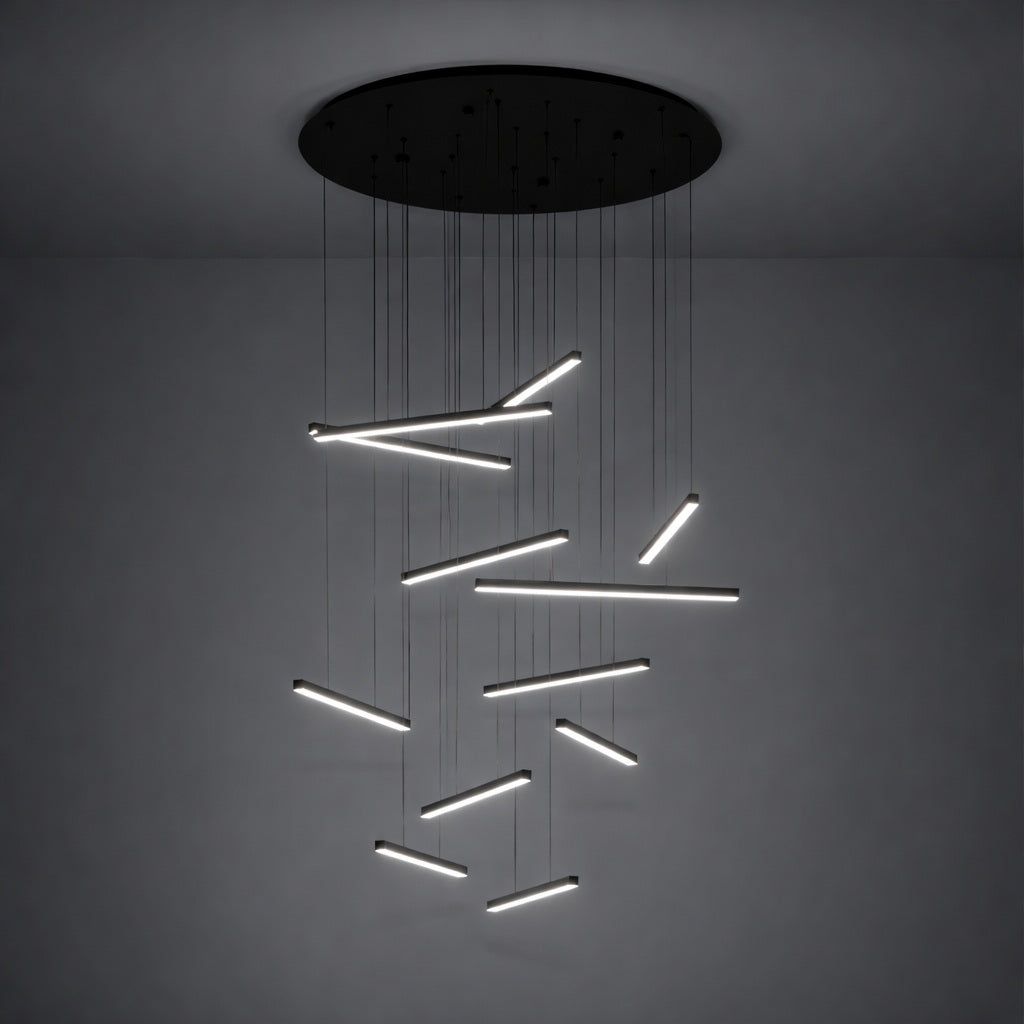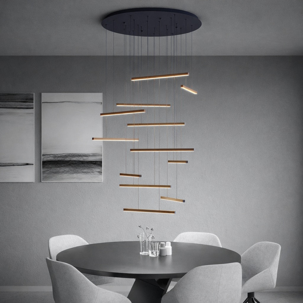 The Eglo LINDOZA LED Pendant Light is a striking statement piece designed to function as both lighting and sculpture. Featuring a series of sleek, rectangular LED light bars suspended at varying heights, LINDOZA creates the visual effect of a floating mobile installation, bringing architectural drama to double-height spaces, stair voids, and modern living areas.