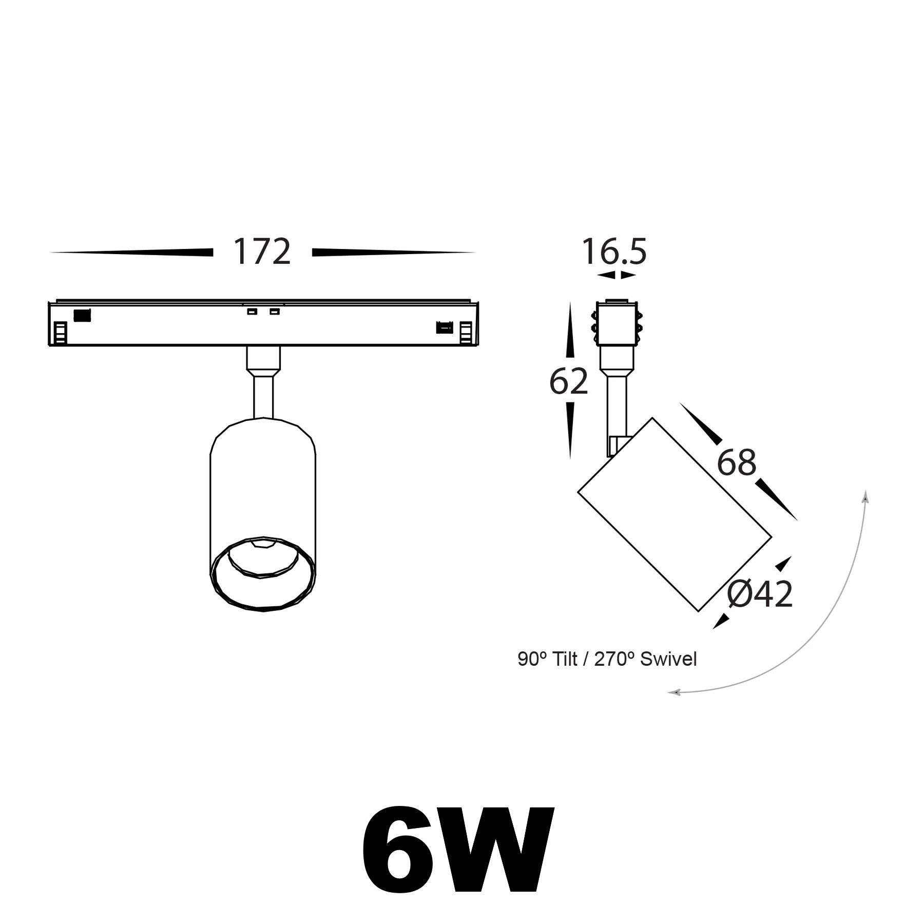 Dimensions: Track adapter length 172mm; Head Ø42mm (6W), Ø52mm (10W), Ø62mm (15W)