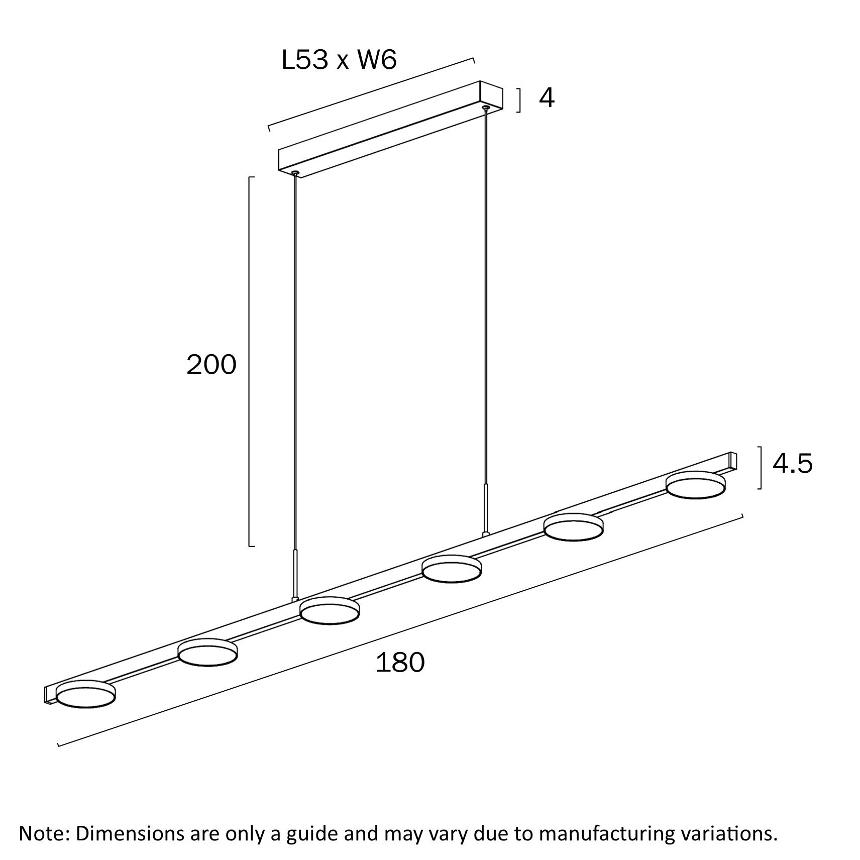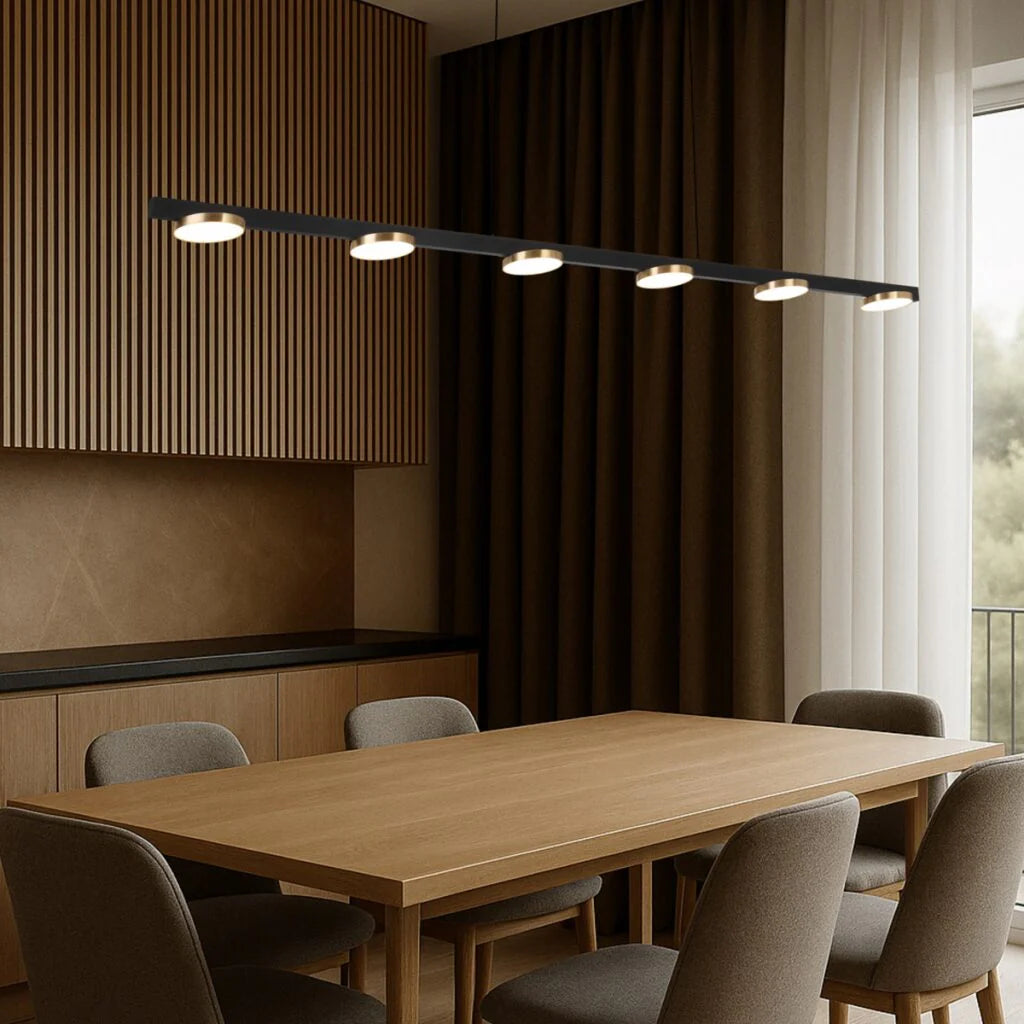 Finished in deep matte black with six elegant brass-rimmed LED discs, it provides warm 3000K illumination with excellent spread along its full 180cm length.
