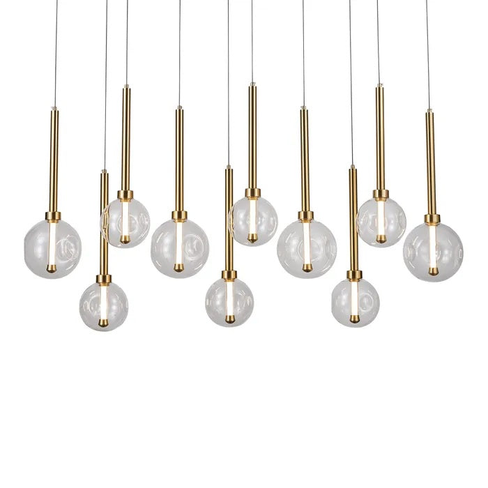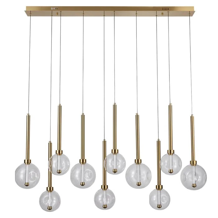 Suspended along a linear satin-gold canopy, ten clear glass globes hang gracefully at alternating heights, each housing a warm 3000 K LED light.